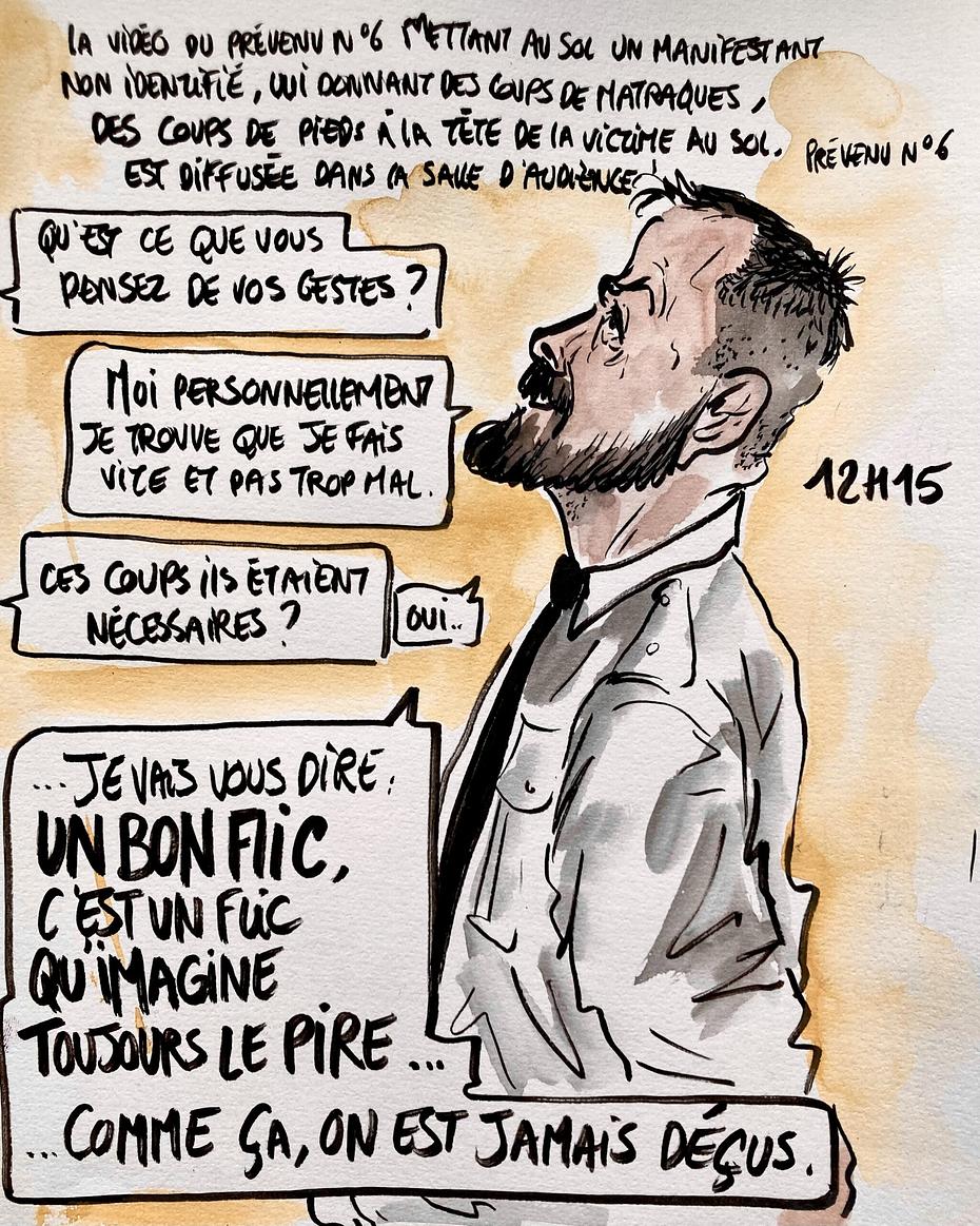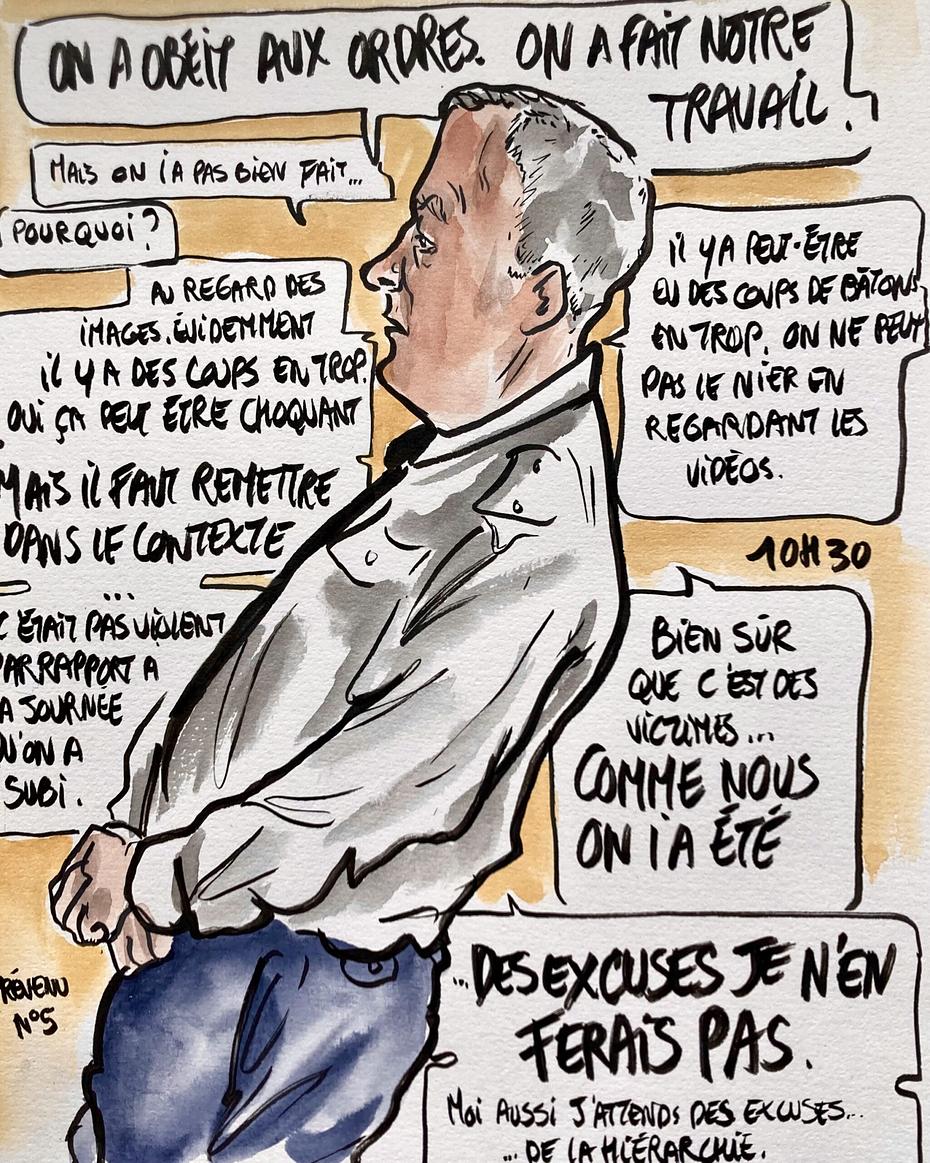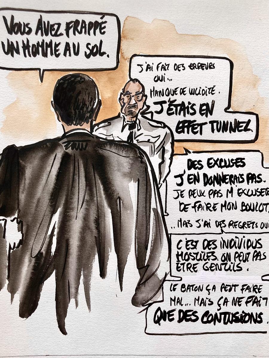Suite du procès des CRS du Burger King, devant la 201e chambre correctionnelle de Paris. Les prévenus policiers décrivent une intervention qu’ils estiment conforme au maintien de l’ordre. Les chefs de section et de groupe renvoient la responsabilité vers la hiérarchie, évoquent l’absence de soutien et dénoncent leur propre traitement judiciaire. Certains regrettent, tous refusent de présenter des excuses à leurs victimes.
